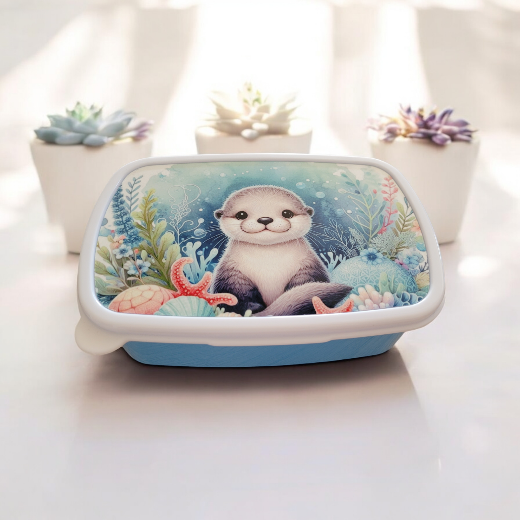 Individuell bedruckbare Lunchbox in weiß, blau und pink erhältlich.